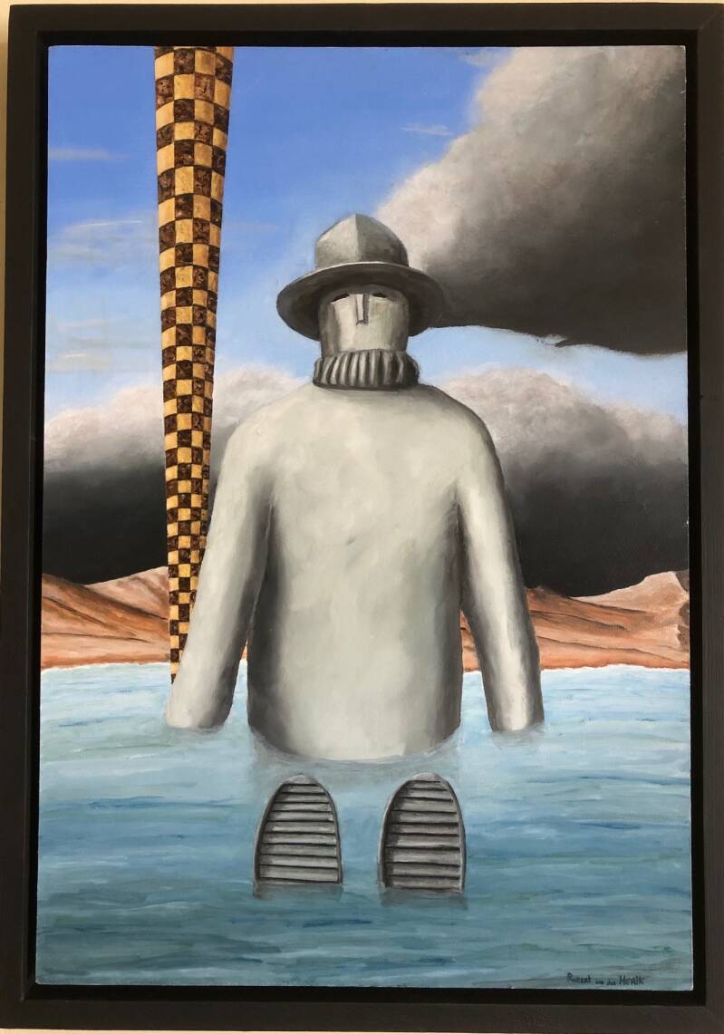 Dit Olieverfschilderij biedt een surrealistisch weergegeven aanblik op de kust in Knokke, Belgische kust, waar het 'mannetje met de hoed', beeldhouwwerk van Folon, uitkijkt op de zee. Het mannetje zit naast de staande lamp die ik in mijn periode als designer ontwierp en maakte. De grote wolken doen een opkomende storm vermoeden.